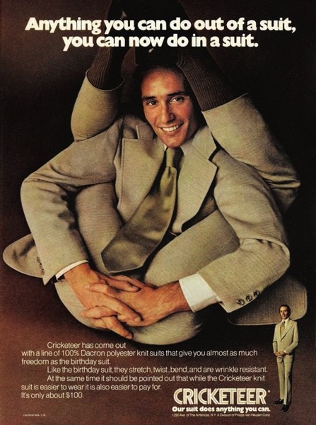 Of course, the classic man’s suit never went out of style. The 100% Dacron polyester suit gave unparalleled freedom of moment, wrinkle-free wear, and a complete lack of breathability. When the temperature rose above 70 degrees, it was like wearing a personal sauna.